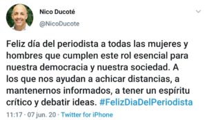 Ducoté en su saludo por el Día del Periodista escribió: «A todas las mujeres y hombres que cumplen este rol esencial para nuestra democracia y sociedad. A los que nos ayudan a achicar distancias, a mantenernos informados, a tener un espíritu crítico y debatir ideas». ¿En serio piensa eso? Entonces ¿por qué no soportó la idea de que hayas críticas a su gobierno y quiso estar de «los dos lados del mostrador»?