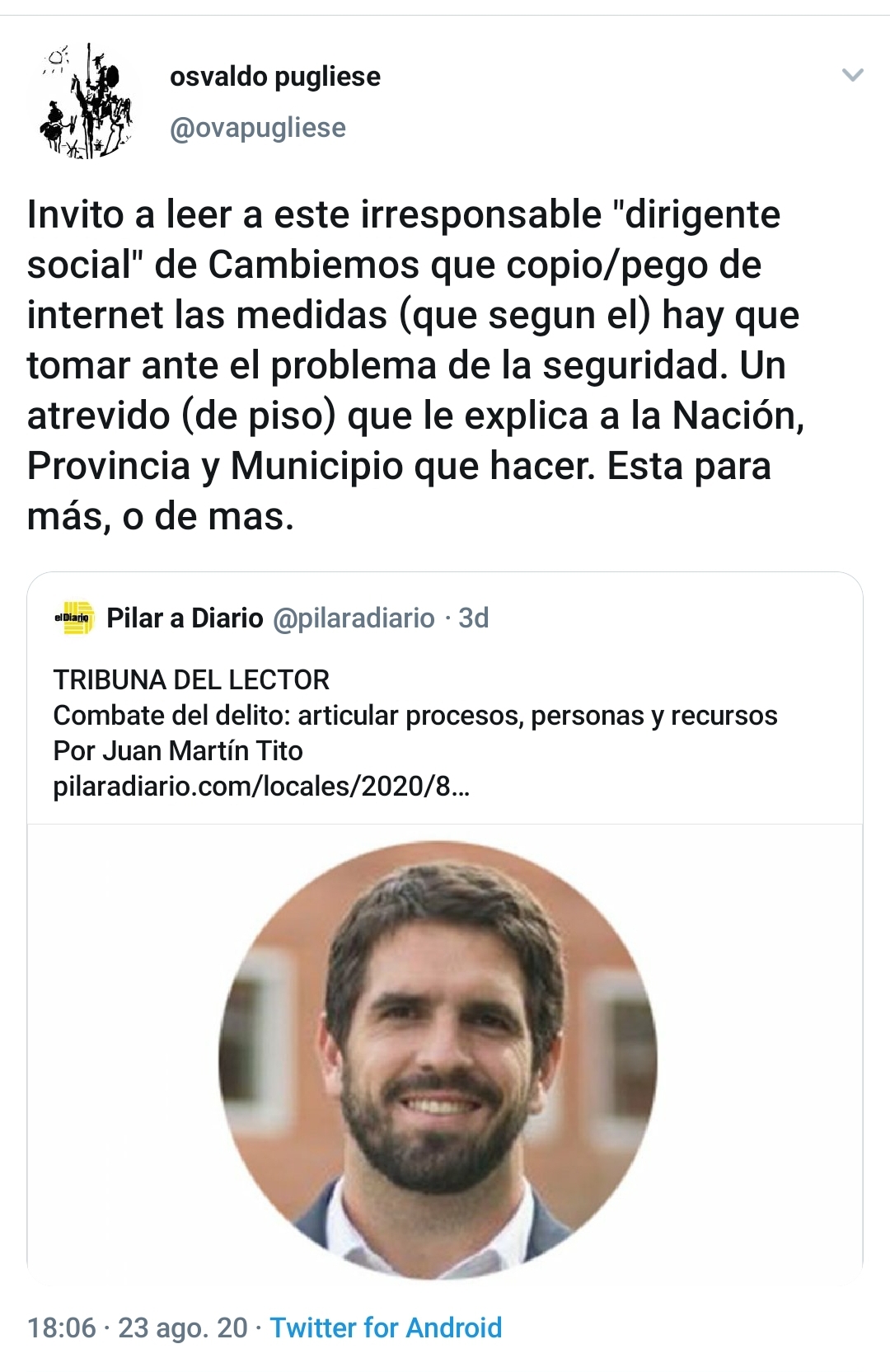 Fue el Dr. Osvaldo Pugliese quien no sólo planteó esa duda sobre quien se autodenomina como «dirigente social». «Invito a leer a este irresponsable «dirigente social» de Cambiemos que copió/pegó de internet las medidas (que según él) hay que tomar ante el problema de la seguridad. Un atrevido (de piso) que le explica a la Nación, Provincia y Municipio qué hacer. Está para más, o de más» lanzó como respuesta a la publicación de Tito en El Diario Regional de Pilar.