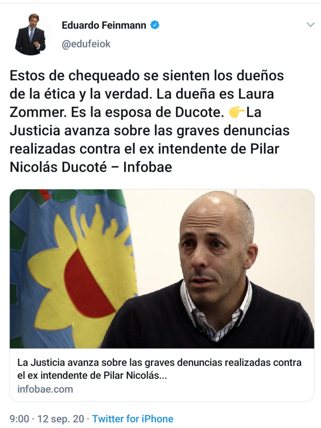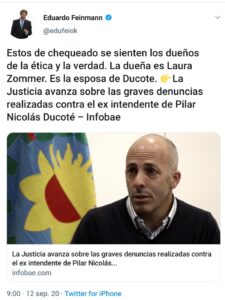 Y hace tan sólo unos días atrás fue el reconocido colega Eduardo Feinmann quien recordó las múltiples causas penales que recaen sobre la gestión de Nicolás Ducoté. Esto fue luego de que Zommer califique como falsa una información brindada por el periodista de A24 y Radio Rivadavia. «Estos de Chequeado se sienten los dueños de la ética y la verdad. La dueña es Laura Zommer. Es la esposa de Ducoté» publicó en Twitter adjuntando la noticia de las graves denuncias contra el egresado de Harvard.