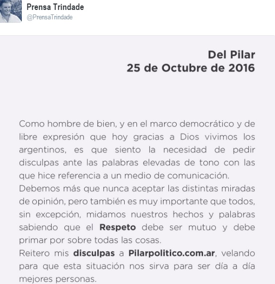 Pilar Político tiene una línea editorial de la cual no se va a correr por esta situación y como siempre buscó que cada informe exponga situaciones sin faltar el respeto. Y Trindade tendrá el mismo espacio y trato que el resto. Sólo espero que su actitud haya sido producto de sólo una mala mañana, aunque sus antecedentes digan otra cosa. Insisto que continuaré por el mismo camino, por si se arrepiente y elige el diálogo directo.