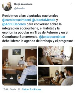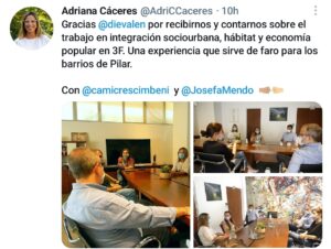 «Gracias @dievalen por recibirnos y contarnos sobre el trabajo en integración sociourbana, hábitat y economía popular en Tres de Febrero. Una experiencia que sirve de faro para los barrios de Pilar» expresó Cáceres en sus redes sociales sobre su visita a Valenzuela. La representante de Pilar que además estuvo acompañada por sus compañeras de banca en el congreso, Camila Crescimbeni y Josefina Mendoza.