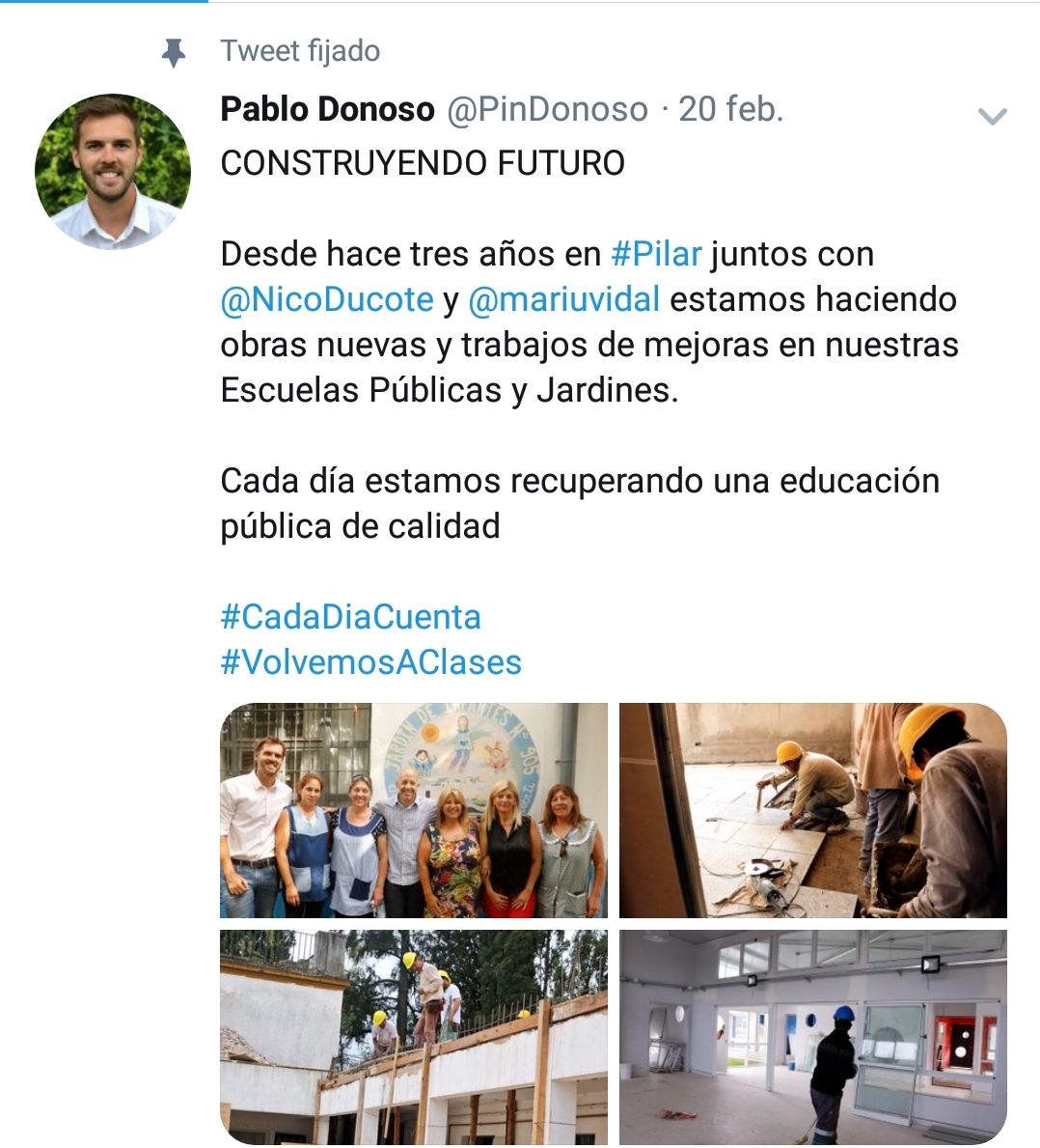Cada día estamos recuperando una educación pública de calidad» ese el mensaje fijado en la cuenta personal de Twitter del Presidente del Consejo Escolar, Pablo Donoso. El responsable junto al Intendente Nicolás Ducoté del estado edilicio de la educación pública del distrito. Los principales protagonistas a raíz del derrumbe del techo de la Escuela Primaria N°25 de Los Cachorros, que tuvo como consecuencia a dos alumnos heridos y la posterior clausura de las aulas. ¿A qué tipo de construcción se refiere el joven Pro? ¿A una circunstancial que le permita llegar a las elecciones siendo candidato a concejal?