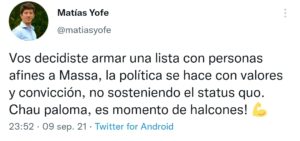 «Vos decidiste armar una lista con personas afines a Massa, la política se hace con valores y convicción, no sosteniendo el status quo. Chau paloma, es momento de halcones!», apuntó Yofe contra el santillista en medio de la última campaña hacia las PASO. Ese mismo mensaje luego fue replicado por Elisa Carrió en un acto teniendo al Profesor de canto aplaudiendo cada tiro por elevación al espacio de Neuspiller.