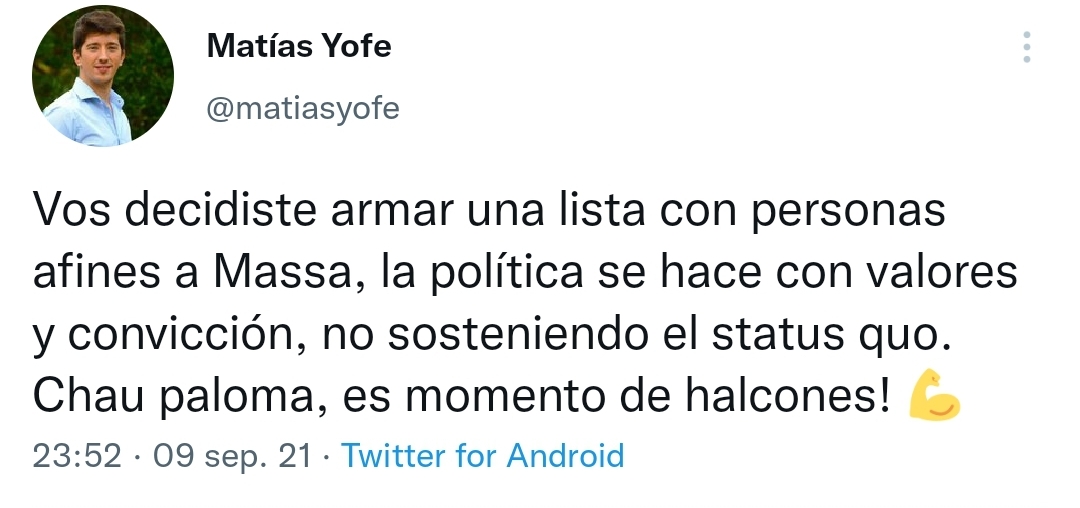 «Vos decidiste armar una lista con personas afines a Massa, la política se hace con valores y convicción, no sosteniendo el status quo. Chau paloma, es momento de halcones!», apuntó Yofe contra el santillista en medio de la última campaña hacia las PASO. Ese mismo mensaje luego fue replicado por Elisa Carrió en un acto teniendo al Profesor de canto aplaudiendo cada tiro por elevación al espacio de Neuspiller.