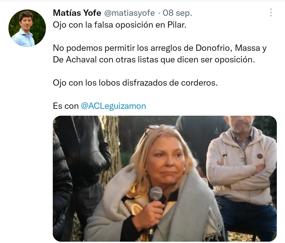 A Yofe le corresponde el noveno lugar, prácticamente no tiene ni la más mínima posibilidad de ingresar al Concejo Deliberante. Seguramente por ello nunca dio marcha atrás con sus acusaciones contra el Dandy. «¿Dónde estuviste estos años? Jamás te vi marchando con nuestros vecinos, jamás te vi luchando contra la tiranía de @FedericoAchaval, palomita, segui volando, que el palomar queda por otro lado en Pilar», fue una de las acusaciones de Yofe hacia Neuspiller.