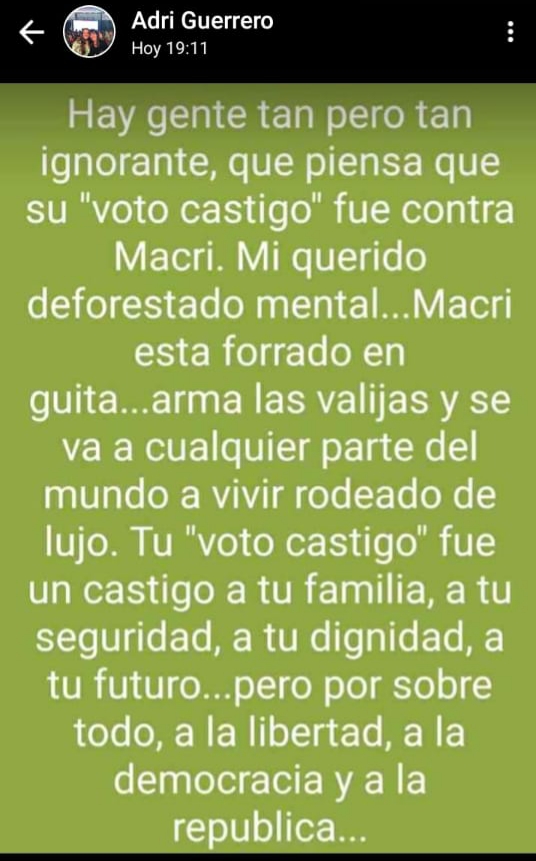 «Hay gente tan pero tan ignorante, que piensa que su «voto castigo» fue contra Macri. Mi querido deforestado mental…Macri está forrado en guita…arma las valijas y se va a cualquier lugar del mundo a vivir rodeado de lujos» apuntó Guerrero en su publicación de estado de WhatsApp. «Tu «voto castigo» fue un castigo a tu familia, a tu seguridad, a tu dignidad, a tu futuro…pero por sobre todo, a la libertad, a la democracia y a la república» agregó la funcionaria.