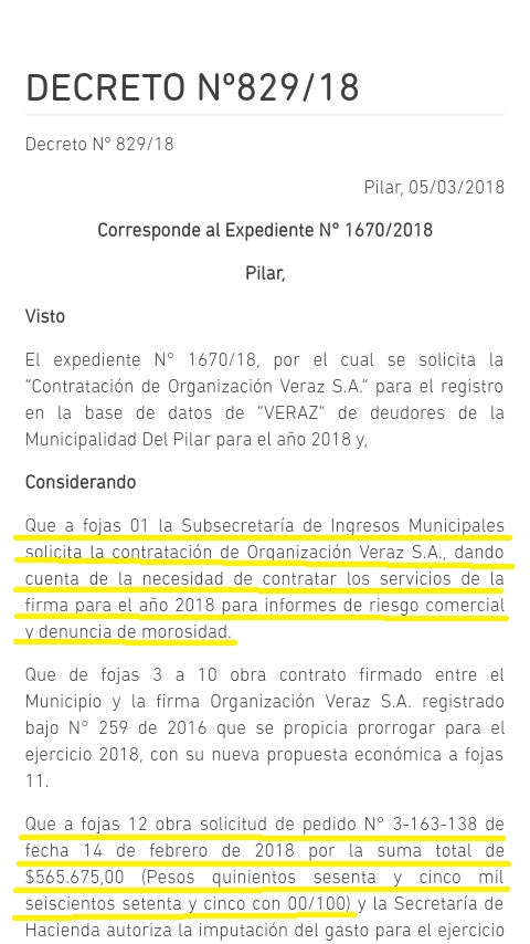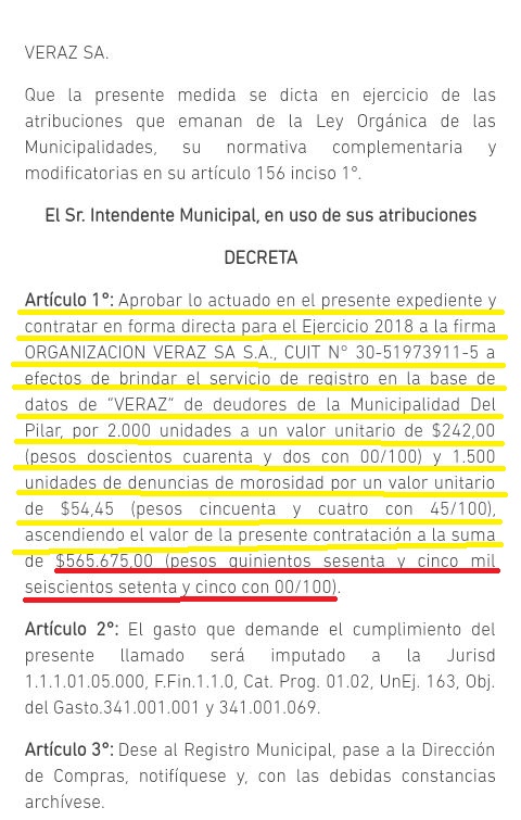 Al igual que en el 2016 y 17, el Subsecretario de Ingresos Municipales, el foráneo Juan Carlos Mairano le solicitó al Intendente la CONTRATACIÓN DIRECTA de Veraz SA (¿es la única empresa que realiza ese trabajo?) «para brindar el servicio de registro en la base de datos de esa firma de deudores de la Municipalidad Del Pilar». El decreto firmado por Ducoté (FOTOS) en marzo pasado indica que incluye 2000 unidades, osea la inclusión de esa cantidad de morosos, y 1500 unidades de denuncias. Todo por la módica suma de $565.675.