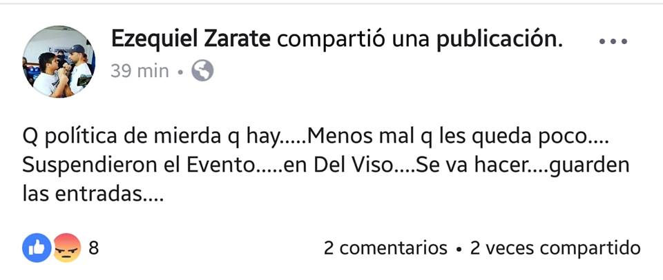 «El Municipio debería apoyar y acompañar este tipo de eventos. Pero no sólo nos ayuda, sino que nos dificulta», expresó decepcionado el campeón de los Pesos Pesados del Consejo Argentino de Box, Esteban Ringo Juárez. «Que política de mierda que hay…Menos mal que les queda poco. Suspendieron el evento en Del Viso», expresó con mucha bronca el retador Ezequiel Chiquito Zárate en las redes sociales.