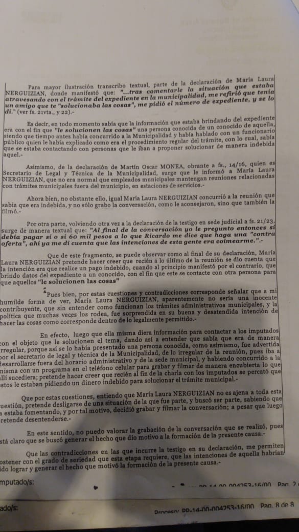Según las declaraciones de los testigos, la contribuyente habló con el Director de Legal y Técnica, Martín Oscar Monea, y luego buscó inculpar a los municipales a través de una cámara oculta realizada con su celular. Prueba que fue desestimada por el juez quien en su fallo expresó: «no puedo valorar la grabación de la conversación que se realizó, pues está claro que se buscó generar el hecho que dio motivo a la formación de la presente causa».