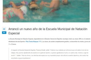 «La Escuela Municipal de Natación Especial, dependiente de la Dirección General de Deportes municipal, inició sus clases 2018, en el natatorio climatizado del club Sportivo Pilar, Avenida Tomás Márquez 1111. Las clases, de carácter completamente gratuito, se desarrollan los martes y jueves de 11 a 13 horas», informaron a través del sitio web oficial de la municipalidad Del Pilar. Increíblemente nunca pensaron en qué los niños del turno mañana no pueden asistir; y a los del turno tarde los obliga a llegar retrasados a sus escuelas, o directamente no ir, dependiendo de las distancias.