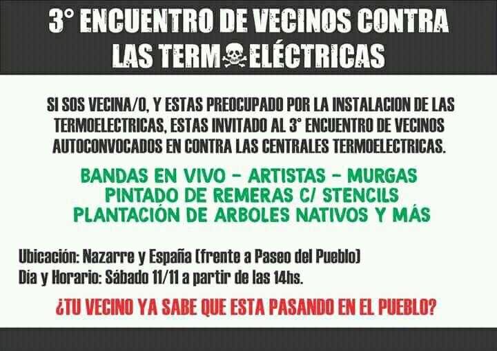 El próximo sábado desde las 14 horas en la esquina de Nazarre y España se llevará adelante el «3° Encuentro de Vecinos contra las Termoeléctricas». Allí no sólo se expresarán en contra estos emprendimientos contaminantes sino que también buscarán unirse más disfrutando de espectáculos culturales.