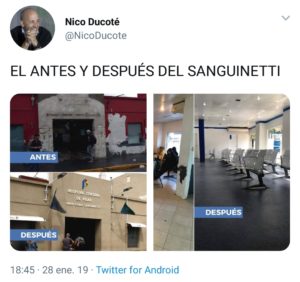 Está claro que las estrategias electoralistas permiten muchas picardías, pero las mentiras «tienen patas cortas». La foto de ANTES de la fachada del Sanguinetti no corresponde al estado anterior del inicio de la gestión Ducoté. En todo caso, si es parte del comienzo de la obra en la remodelación de la fachada. ¿Nuevamente buscó engañar a los vecinos?