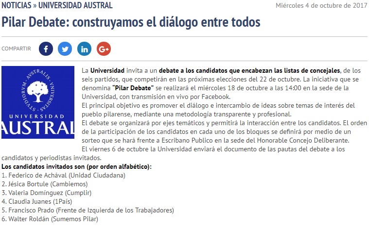 «Fue en las aulas del Campus de Pilar de la Universidad Austral donde germinó la idea de organizar debates entre los candidatos presidenciales del 2015 sobre el proceso electoral que se avecinaba, formando parte la propia Universidad de la organización de “Argentina Debate”. Ahora, a tres años de haber decidido establecer su sede central en Pilar, esta Universidad siente el compromiso de incorporar en este distrito una metodología profesional similar», es el mensaje difundido por la institución para argumentar su preocupación por aportar su granito a la democracia. Casualidad o no, surge luego de la derrota del oficialismo local en las PASO.