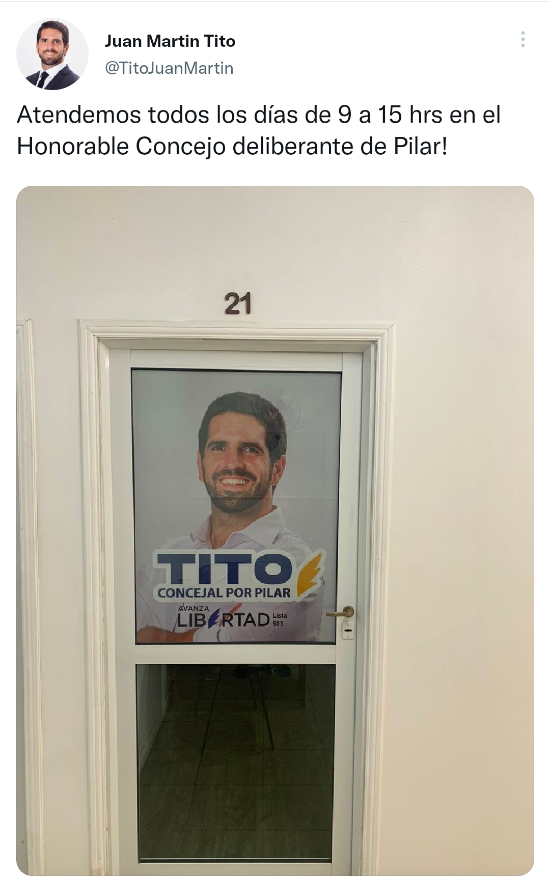 Ahora, en su vuelta, Tito decidió ponerle horario a su función de concejal del pueblo de Pilar. «Atendemos todos los días de 9 a 15 horas en el Honorable Concejo Deliberante de Pilar» mencionó en una publicación en su cuenta de Twitter durante la semana pasada. Aclarando que «todos los días» se reduce a de lunes a viernes, ósea el horario administrativo de todas las dependencias municipales. ¿Y si un vecino lo necesita fuera de ese horario?