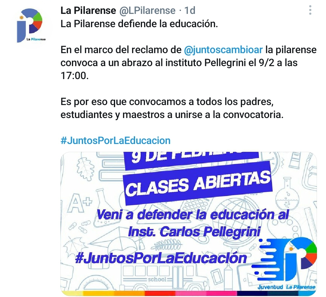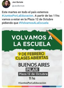 A muy poco tiempo del regreso efectivo de las clases presenciales para el ciclo lectivo 2021, el macrismo toma la educación para su campaña y muestra cada vez más sus peleas por las próximas candidaturas. Como en muy pocos distritos del conurbano bonaerense, Pilar tendrá dos manifestaciones del reclamo «Volvamos a la escuela» (¿quién no va a volver?). De esta situación confusa habló la actual Presidenta de la mesa local de la Coalición Cívica, Jésica Bortule y profundizó las diferencias con el sector que lidera el Profesor de canto de Nicolás Ducoté, Matías Yofe.