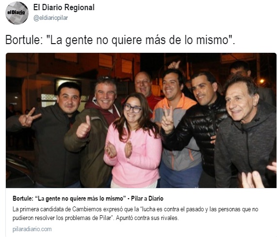 «La lucha es contra el pasado y las personas que no pudieron resolver los problemas de Pilar», les aseguró Bortule a los colegas. No obstante, a la misma se la puede observar festejando su caudal de votos que la depositó en el segundo lugar de las PASO 2017 y a su lado integrantes de la anterior gestión que ella tanto critica. La figura más reconocida en esa imagen es el derquino Darío Pascual, quien durante los doce años de kirchnerismo fue tesorero del Consejo Escolar de Pilar. Fue parte del molinismo hasta semanas previas a la campaña, al igual que Diego Rodríguez y Ezequiel García quienes lo acompañan en la foto. Hoy todos están en el Centro de Atención Vecinal de Presidente Derqui. ¿A eso se refiere Jesi? ¿Contra ese tipo de personas es su «lucha»?