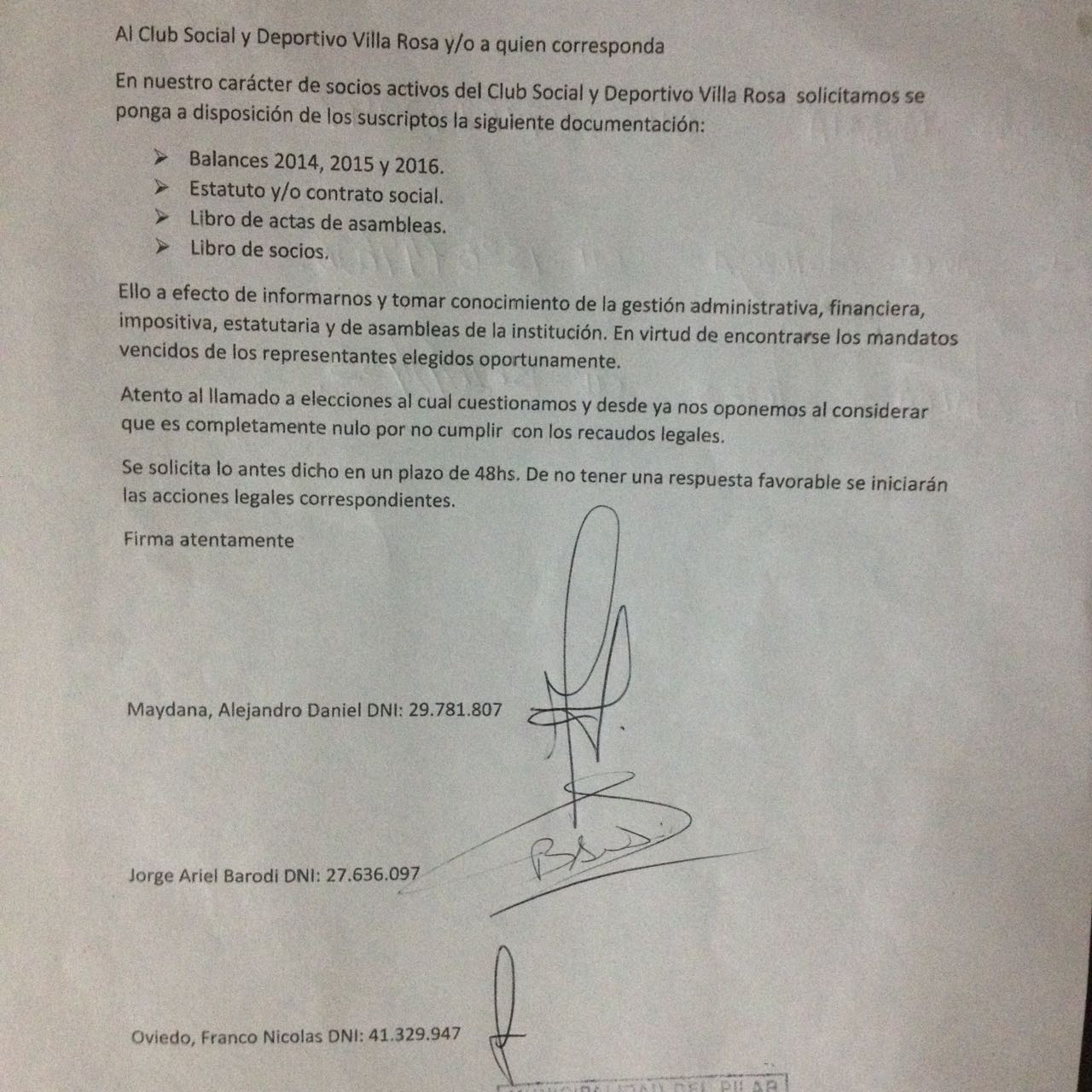 Como socios activos, Alejandro Maydana, Jorge Baroni y Franco Oviedo solicitaron la información de: los balances de los años 2014, 2015y 2016; estatuto y/o contrato social; libro de actas o asambleas; y el libro de socios. Estas tres personas argumentan que los mandatos de la actual CD ya están vencidos, por lo cual es nulo el llamado a elecciones hecho el pasado martes 24 de enero. Por ello mismo, advierten que no recibir lo solicitado, iniciarán acciones legales.