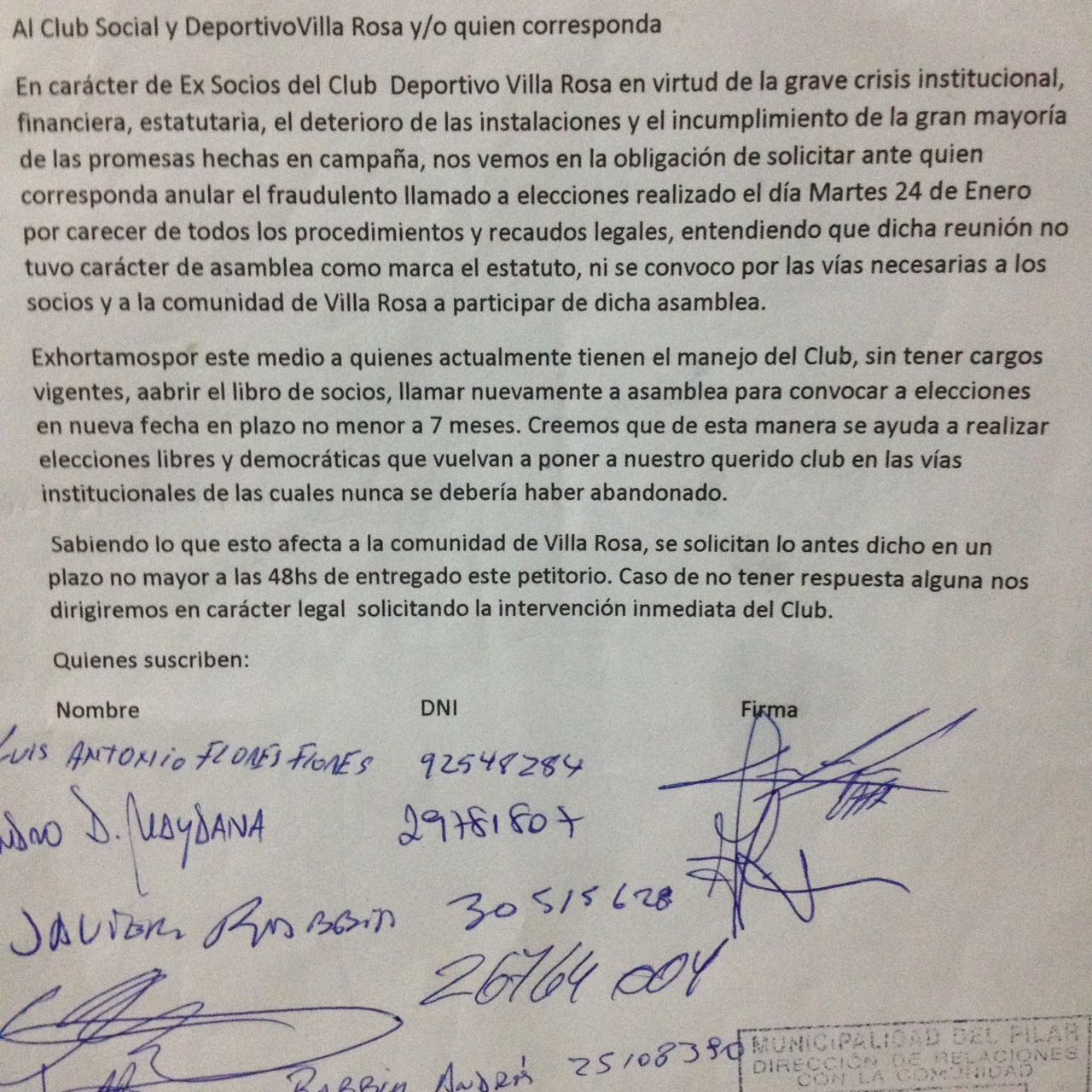 “Nosotros respondemos al gobierno de turno”, admitió el Presidente de Deportivo Villa Rosa, José Tano Barrera, en un chat de un grupo de Whatsapp. Por eso mismo acudió a la ayuda de la Dirección de Relaciones Institucionales, para llamar a elecciones en un contexto poco transparente y así tratar de persistir en un lugar donde un sector importante del club ya no lo quiere. En busca de impedir la falta de democracia, un grupo de socios activos y otros ex socios que se alejaron por los turbios manejos de los dirigentes, se unieron para solicitar un llamado real y legítimo de “elecciones libres y democráticas”.