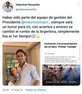 Quien si se hizo cargo de haber sido parte de la gestión macrista y responsable de muchas decisiones que se tomaron durante esos cuatro años fue Sebastián Neuspiller. «Haber sido parte del equipo de gestión del Presidente Mauricio Macri, siempre será un honor para mi, con aciertos y errores se cambió el rumbo de la Argentina, simplemente fue el 1er tiempo!», expresó en Twitter el ex concejal, ex Intendente interino, ex integrante del Directorio de IOMA, ex Superintendente de Servicios de Salud, entre otros cargos que recibió entre el 2015 y 2019. Como no va a estar contento de ser macrista.