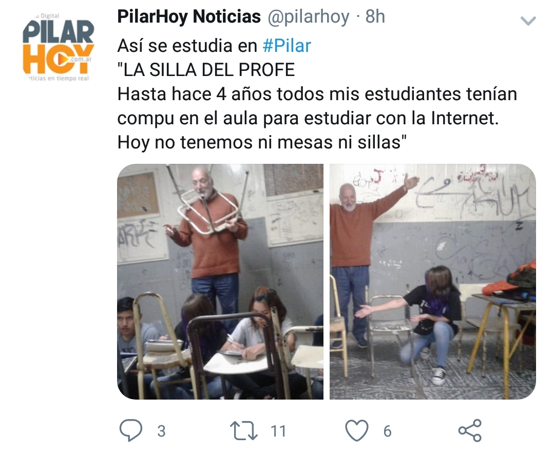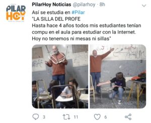Lo que ocurre en esa escuela de nivel secundario es la realidad de la mayoría. Apenas se inició el ciclo lectivo 2019 se supó que en la Escuela Técnica N°1 de Pilar el mobiliario es escaso. Alumnos y docentes deben rotar para poder utilizarlo, pero visualmente se pudo comprender mejor la situación con unas fotos que publicaron el Profesor Néstor Sito y sus alumnos. «Hasta hace 4 años todos mis estudiantes tenían compu en el aula para estudiar con internet. Hoy no tenemos ni mesas ni sillas», manifestó Sito con los colegas de Pilar Hoy mostrando como quedaron sólo los esqueletos de las sillas.