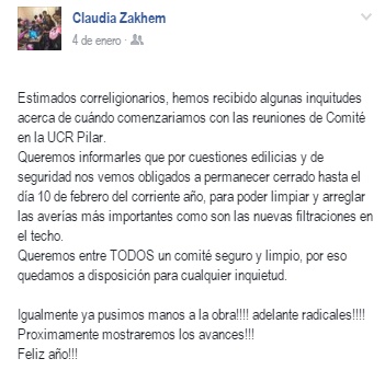 “Queremos informarles que por cuestiones edilicias y de seguridad nos vemos obligados a permanecer cerrado hasta el día 10 de febrero del corriente año, para poder limpiar y arreglar las averías más importantes como son las nuevas filtraciones en el techo. Queremos entre TODOS un comité seguro y limpio, por eso quedamos a disposición para cualquier inquietud” fue una parte del comunicado emitido por Claudia Zakhem, al que lo acompañó un video donde se reflejaba el pésimo estado de la casa partidaria de la Unión Cívica Radical. Fue el primer paso para una pelea, por ahora cibernética, entre la nueva (y vieja) conducción liderada por la concejal denunciante y la anterior, apuntando específicamente a Soledad Echave y Vladimir Braillard.