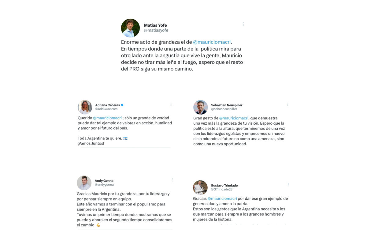 Según las últimas mediciones, Mauricio Macri tiene un 70% de imagen negativa, con lo cual lo más probable era que sufriera la misma dura derrota del 2019. Por eso, Sebastián Neuspiller, Adriana Cáceres, Andrés Genna Grau, Gustavo Trindade, Matías Yofe, entre otros, respiraron aliviados por el anuncio del ex Presidente.