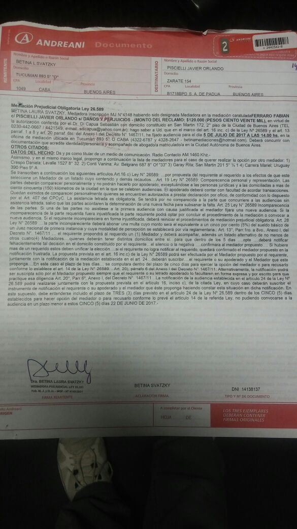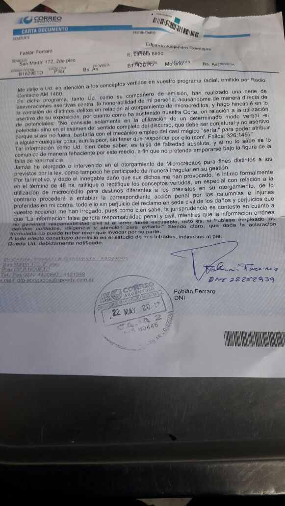 «Han realizado una serie de aseveraciones asertivas contra la honorabilidad de mi persona, acusándome de manera directa de la comisión de distintos delitos en relación al otorgamiento de microcréditos», esas fueron las palabras elegidas por Ferraro para enviar la primera carta documento a los colegas de AM1460.