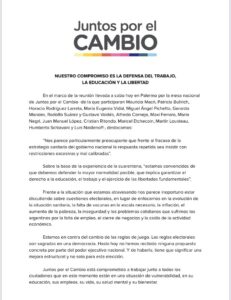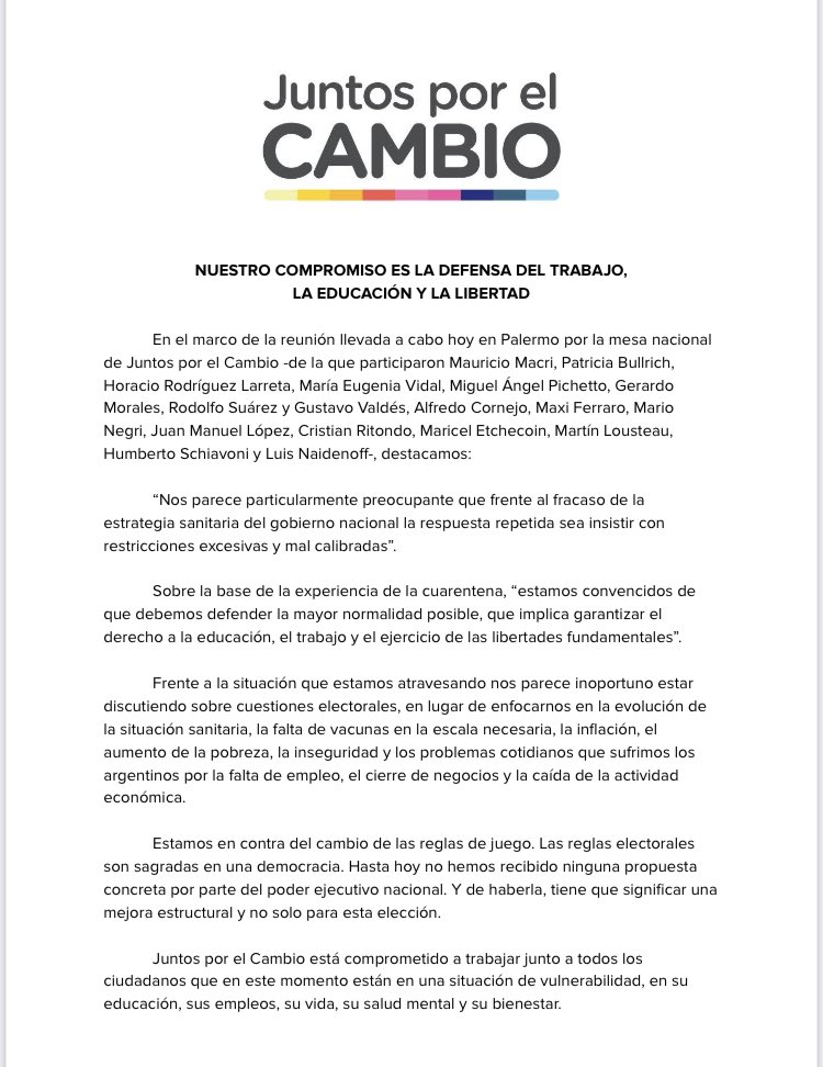 «Nos parece particularmente preocupante que frente al fracaso de la estrategia sanitaria del gobierno nacional la respuesta repetida sea insistir con restricciones excesivas y mal calibradas» indicaron desde la mesa nacional de «Juntos por el Contagio», hoy con varios aislados debido al contacto estrecho que tuvieron con el Diputado Provincial Alex Campbell, inclusive Mauricio Macri.