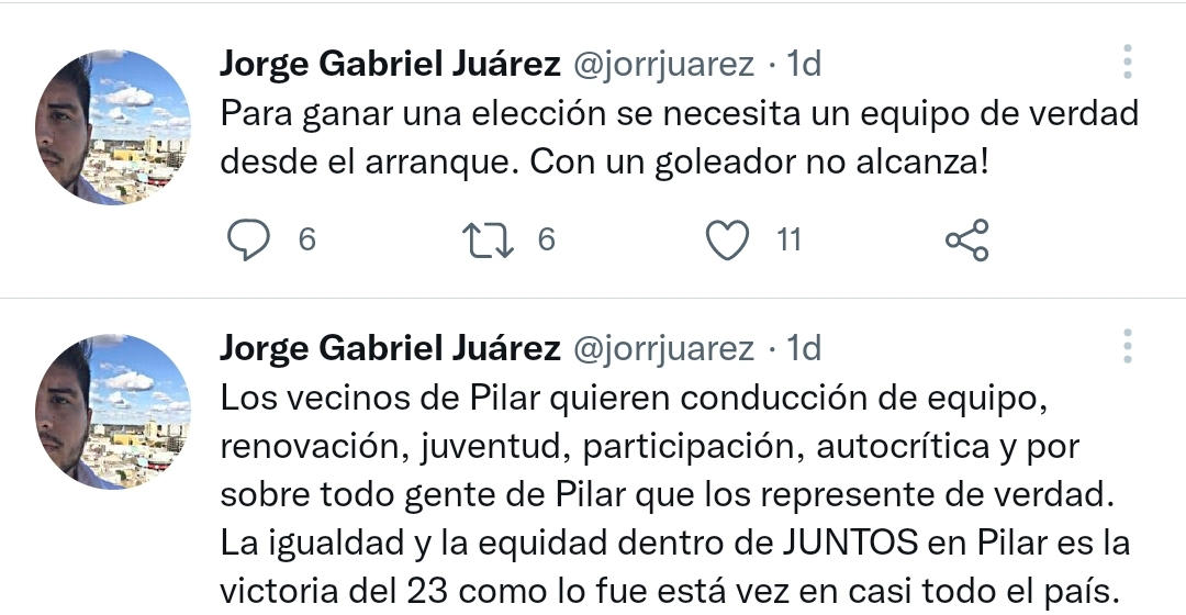 Al autoproclamado líder de la oposición, Sebastián Neuspiller, también le lanzaron algunos dardos. «Para ganar una elección se necesita un equipo de verdad desde el arranque. Con un goleador no alcanza!», señaló a través de Twitter, Jorge Juárez, también ex candidato a concejal de la lista macrista de Pilar. «Así como las PASO fueron históricas en récord de votos, las Generales también lo fueron por la caída, marcando la falta de unidad, la falta de conducción y la poca autocrítica de la que también fui parte», agregó el ex empleado municipal.