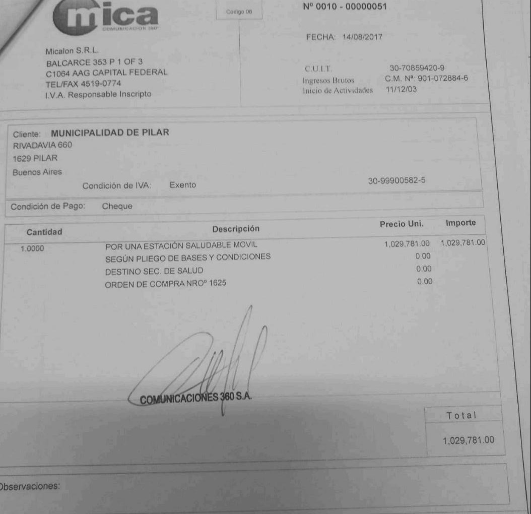 «La Comunicación 360°, nuestra herramienta. La publicidad tradicional comunica la existencia de una marca, la Activación hace que ella sea parte de tu vida. La Activación es nuestra filosofía», son los slogans de Mica, mejor dicho Micalon SRL. Quien le facturó al municipio $1.029.781 «por una estación saludable según pliego de bases condiciones. Destino Secretaría de Salud». Lo raro es que con su CUIT 30-70859420-9 tiene como principal actividad «731009 servicios de publicidad». ¿A quién se le ocurrió que esa firma podía aprovechar ese llamado a licitación? ¿O solamente pusieron su sello y el contenedor tuvo otro origen?