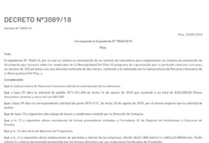 A través del Boletín Oficial en varias oportunidades se han publicados los decretos del egresado de Harvard sobre las distintas evaluaciones y capacitaciones a los integrantes de la planta municipal. La última de ellas data del 20 de septiembre, en el cual se detalla la contratación de «la proveedora municipal BRUZZO MARÍA DEL PILAR, CUIT 27-24560748-8, por la suma de $252.000, correspondiente a la contratación de un servicio de consultoría para implementar un sistema de evaluación de desempeño que rija para todos los empleados de la Municipalidad del Pilar. El programa de capacitación que se pretende contratar será para un alcance de 350 personas con una duración estimada de dos meses, conforme a lo solicitado por la Subsecretaría de Recursos Humanos de la Municipalidad del Pilar».