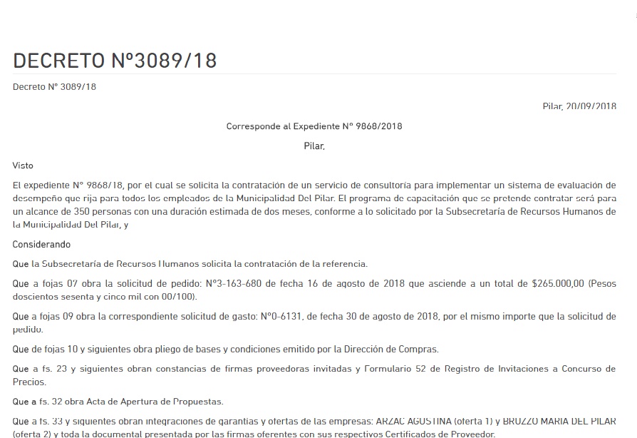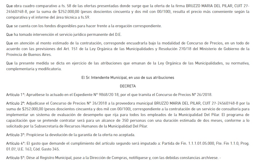 A través del Boletín Oficial en varias oportunidades se han publicados los decretos del egresado de Harvard sobre las distintas evaluaciones y capacitaciones a los integrantes de la planta municipal. La última de ellas data del 20 de septiembre, en el cual se detalla la contratación de «la proveedora municipal BRUZZO MARÍA DEL PILAR, CUIT 27-24560748-8, por la suma de $252.000, correspondiente a la contratación de un servicio de consultoría para implementar un sistema de evaluación de desempeño que rija para todos los empleados de la Municipalidad del Pilar. El programa de capacitación que se pretende contratar será para un alcance de 350 personas con una duración estimada de dos meses, conforme a lo solicitado por la Subsecretaría de Recursos Humanos de la Municipalidad del Pilar».