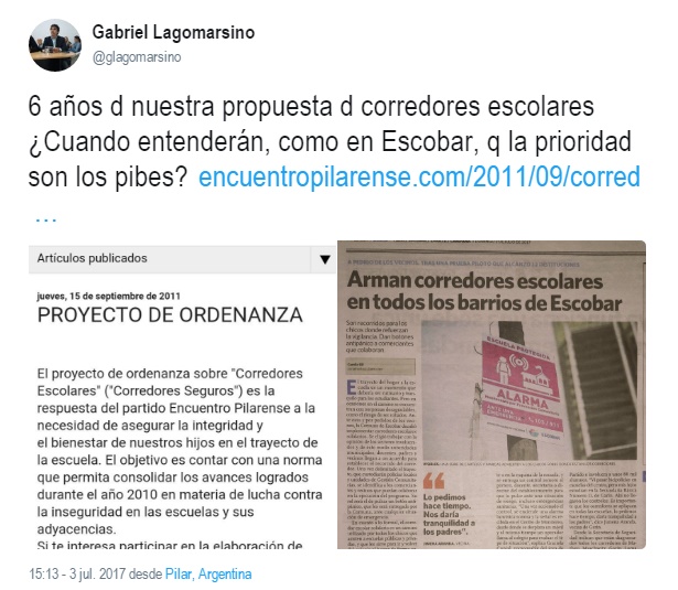 «6 años de nuestra propuesta de corredores escolares ¿Cuándo entenderán, como en Escobar, que la prioridad son los pibes?», fue el tuit con el que Lagomarsino disparó y encendió la polémica. Sin dudas que el problema existe, que se han tomado pocas decisiones para solucionarlo y genera mucho temor en los padres por lo que les pueda ocurrir a sus hijos en el ingreso o salida de las escuelas; pero ¿por qué ahora? ¿El funcionario como cualquier vecino intenta presionar en la época electoral para obtener resultados más rápidos? ¿O es un pase de factura por la indiferencia con la que fue tratado su espacio político a la hora del armado de la nómina de candidatos?