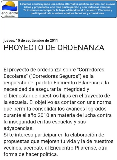 En abril pasado, un grupo de padres se acercaron a la Defensoría del Pueblo para solicitar ayuda en busca de que se reactive la ordenanza votada en el 2011. Según ellos, dejó de estar activa desde el 2012 aproximadamente. «Los corredores no funcionan por más que digan que sí, son el trayecto por donde los chicos circulan, no es la esquina de un colegio”, expresó Sandra Crespo, una de las mamás, en diálogo con El Diario Regional de Pilar. Y aseguró que a pesar de que a principios de este año se reunieron con las autoridades policiales y la secretaria de Educación, Marcela Campagnoli, para coordinar el funcionamiento, no se reactivó.