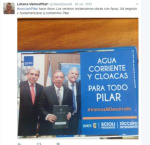 Como tantos vecinos de Pilar en las últimas dos décadas y media, Donnoli apuntó contra las anteriores autoridades por el servicio de la red de agua y cloacas. La actual Interventora de William Morris criticó duramente a Humberto Zúccaro y al kirchnerismo por el convenio firmado con AySA en el 2015. Su problema es que Nicolás Ducoté siguió por el mismo camino, pidió la prórroga del contrato de Sudamericana y publicitó para el 2017 la llegada de la prestadora nacional pero aún no se concreta. “#zuccaroPilar hace años los vecinos reclamamos obras con AySA, Ud negoció con Sudamericana que contaminó Pilar”, publicó el pasado 20 de octubre del 2015, ¿ahora sufre la misma historia?