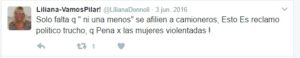 Este perfil no se limita al pedido de la salida de los K y la vuelta de los militares, sino también lo demuestra poniéndose de la vereda de enfrente de manifestaciones de problemáticas sociales como la violencia de género. Donnoli estando en funciones criticó a la iniciativa de #NiUnaMenos, “Sólo falta que “ni una menos” se afilien a camioneros. Esto es reclamo político trucho, que pena por las mujeres violentadas”, expresó el pasado 3 de junio del 2016.