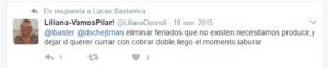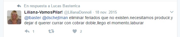 Su personalidad tampoco muestra un sentido solidario hacia los trabajadores o comprensión de sus derechos. A sus palabras despectivas refiriéndose al Sindicato de Choferes de Camiones, le sumó otros tuits como: “Eliminar feriados que no existen, necesitamos producir, y dejar de currar con cobrar doble, llego el momento, laburar”. Evidentemente, no está de acuerdo con las leyes laborales. En realidad, está en sintonía con un modelo de país, que la coyuntura demuestra que no es el indicado. “¡Yo quiero volver a los ’90!”, exclamó en más de una oportunidad.