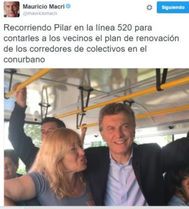 “Recorriendo Pilar en la línea 520 para contarles a los vecinos el plan de renovación de los corredores de colectivos en el conurbano” ese mensaje vía Twitter de Macri, junto a una foto con actores se vendió como una de las acciones de gestión en Transporte. También fue cómplice de la mentira Ducoté, a quien le dieron un papel secundario y casi no sale en la foto del backstage.