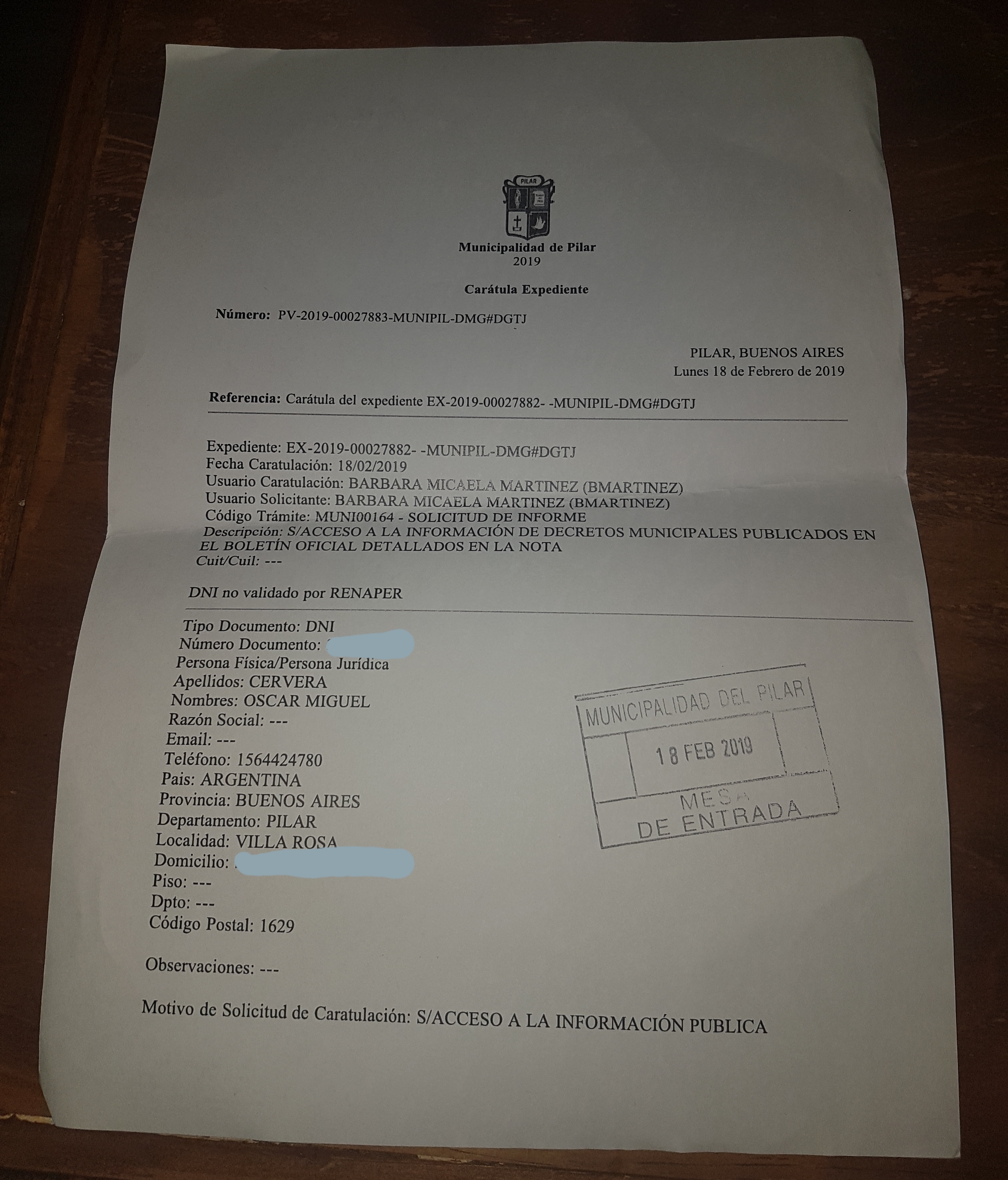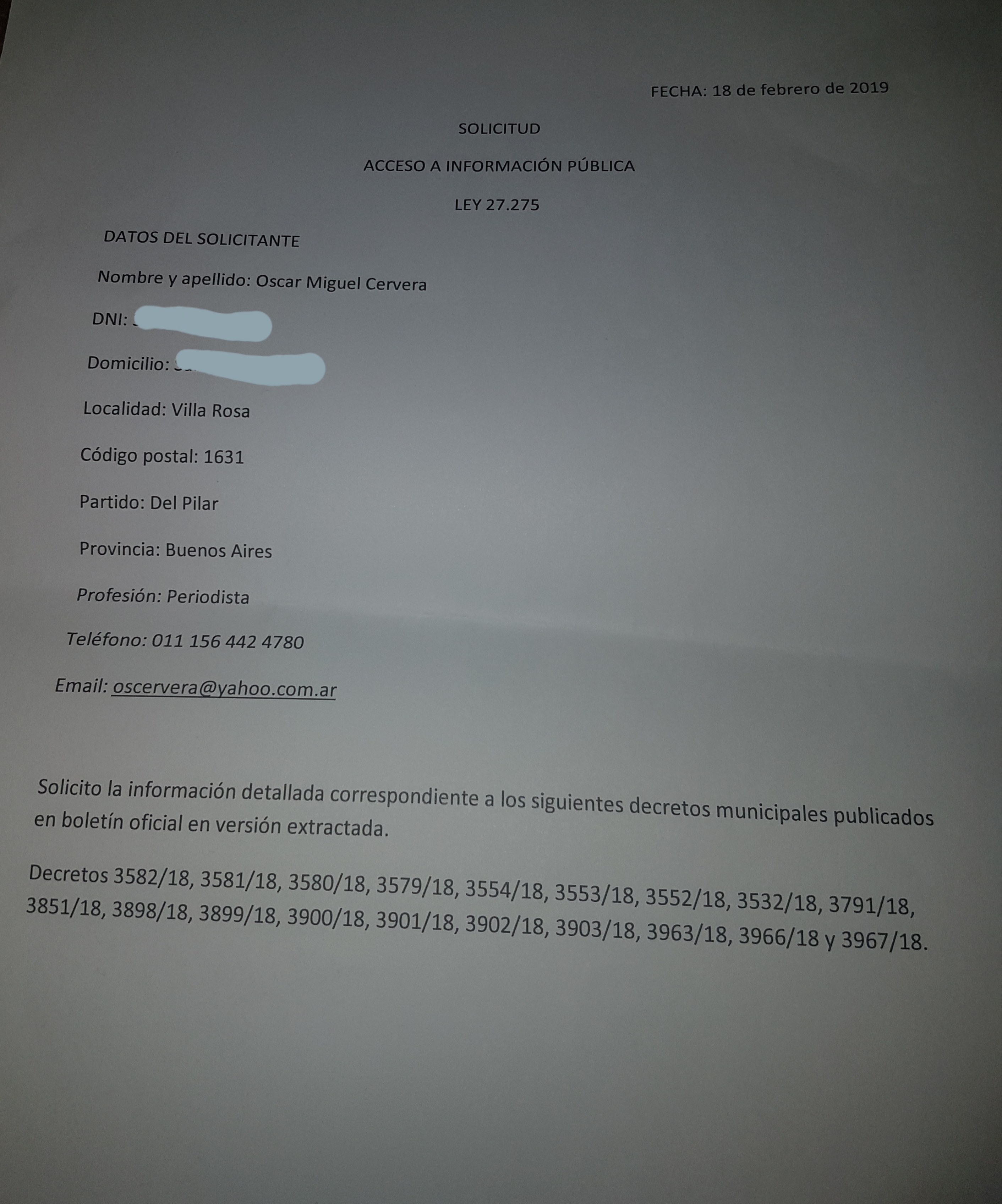 Más allá del rol de periodista, utilice la chance que tienen todos los pilarenses. Elegí 18 decretos, al azar, de eximiciones de impuestos (hay muchos más) y a través de la Mesa de Entrada solicite el «Acceso a la Información Pública». La curiosidad me llevó a querer indagar que hay detrás de esa «Versión extractada». Si es por cuestión de tiempo que no muestran toda la información o el Intendente Ducoté decretó algo que puede ser favorable para una parte de la sociedad e injusto para otra.