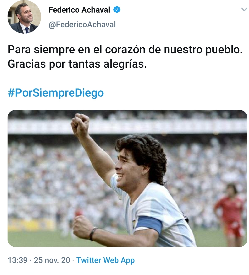 Nadie pudo quedar exento de una tristeza que generó una lágrima en los ojos, todos de alguna u otra manera sintieron que ayer dijo adiós alguien que les produjo felicidad. Se fue quien verdaderamente puso en boca de todo el mundo el nombre de nuestro país. Se fue el mejor de todos los tiempos del deporte que amamos los argentinos. D10S dejó de ser terrenal para tomar su verdadero rol de un ser sobrenatural. Hasta siempre Diego. ¡GRACIAS!