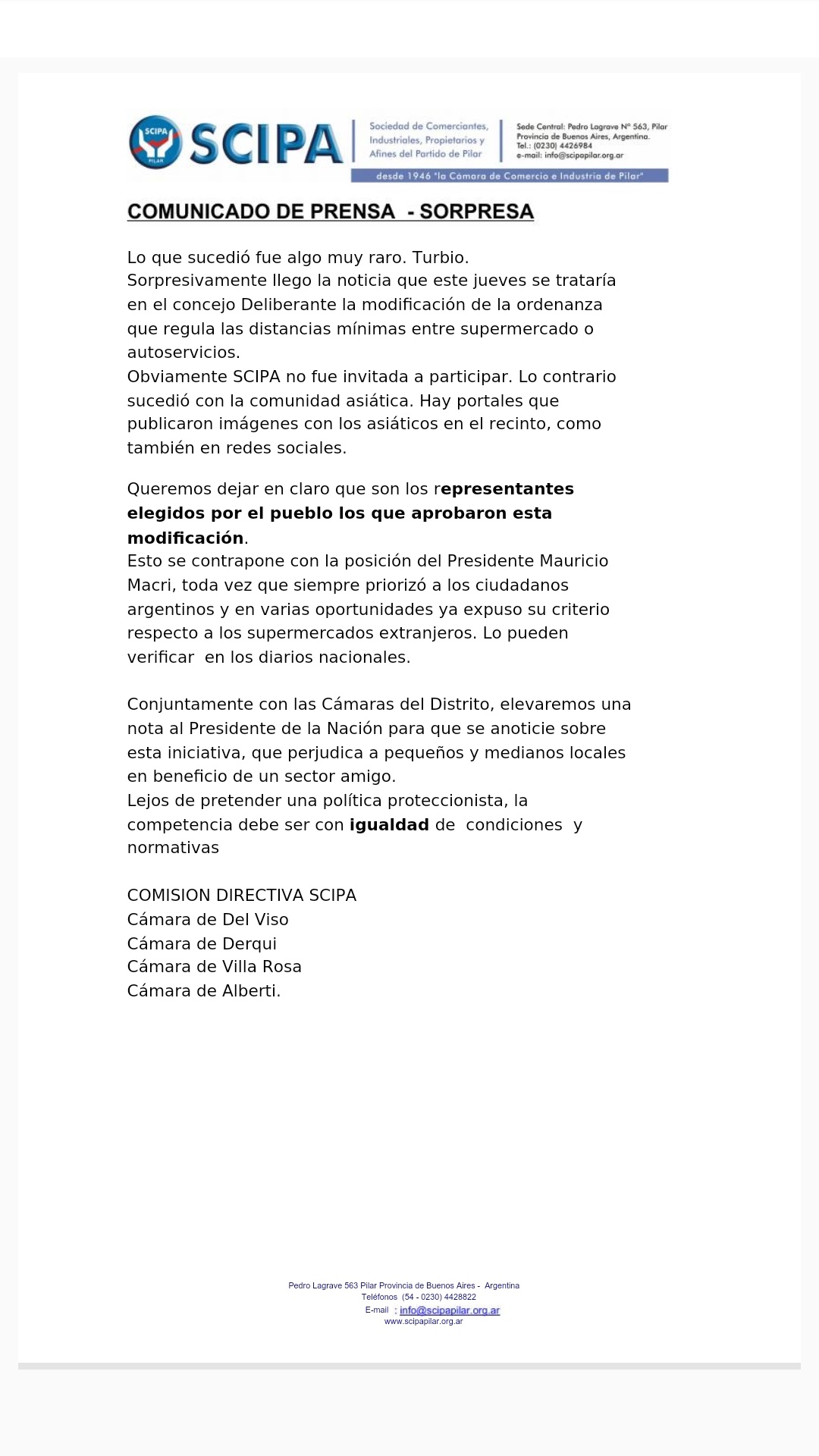 «Lo que sucedió fue algo muy raro. Turbio», así lo calificaron las cámaras de comerciantes de Pilar, Del Viso, Presidente Derqui, Villa Rosa y Manuel Alberti. «Queremos dejar en claro que son los representantes elegidos por el pueblo los que aprobaron esta modificación», resaltaron en su comunicado de prensa. «Lejos de pretender una política proteccionista, la competencia debe ser con igualdad de condiciones y normativas», concluyeron y advirtieron que enviaron una carta al Presidente Mauricio Macri para exponer lo que se vive en Pilar.