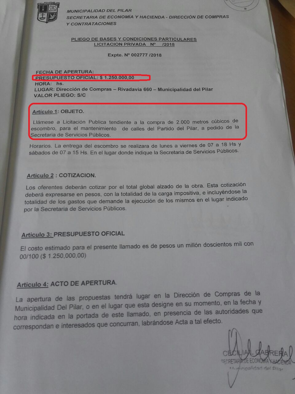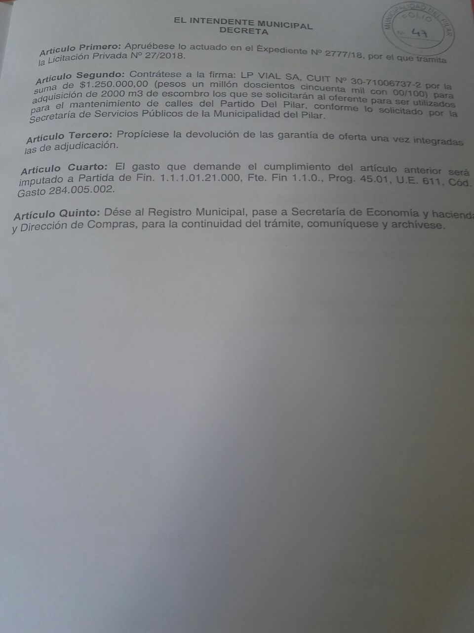 ¿Año de transición? ¿Significa que el vecino deberá esperar para pisar asfalto en su barrio? Según el Intendente Nicolás Ducoté tiene planificado pavimentar 300 cuadras y el doble si lo autorizan a seguir endeudando a la Comuna con otro préstamo que solicitó a la provincia. Sin embargo, la Secretaría de Servicios Públicos, a cargo de Eduardo Villar (¿ya asumió o sigue de vacaciones?), licitó la compra de escombro por la módica suma de $1.250.000 para el «mantenimiento de calles» según el expediente (FOTO) al cual pudo acceder Pilar Político.