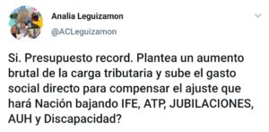 A través de las redes sociales, la edil Leguizamón plantea el interrogante si la Comuna incrementará el gasto social para compensar un posible ajuste a nivel nacional. ¿Cree que está mal? ¿O prefiere gastar el dinero en el Veraz como lo hacía Ducoté? ¿Para ella era mejor las intimaciones y denuncias por ese medio que las ayudas sociales para los sectores más vulnerables del distrito?