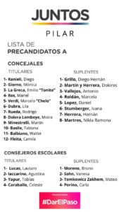 Secundando a Ranieli aparece la contadora derquina Mónica Giorno. Luego el actual Presidente del Cómite de la UCR, Emilio Tonito La Greca. Reconocido en Pilar por ser el propietario de la Clínica Privada Nuestra Señora de Fátima participará por segunda vez consecutiva en un acto eleccionario. En el 2019 tuvo un lugar menos relevante en la lista de Juntos por el Cambio. Hoy se convirtió en el referente local del radicalismo para las PASO. Detrás de él también estará la actual concejal radical, Mariel Ros, quien buscará renovar su banca.