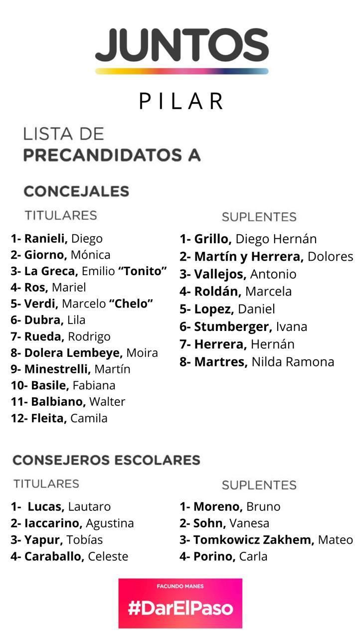 Diego Ranieli es el principal protagonista al ser el primer precandidato a concejal. El abogado buscará su cuarto período como legislador local. Fue electo en el 2007 cuando integró la lista de Unión Pro; en el 2011 en una alianza del denarvaismo con la UCR; y en el 2017 con Juntos por el Cambio. Además desde febrero del 2015 es el titular del Juzgado de Faltas N°2 de Pilar. A lo largo de su carrera política también ocupó diferentes cargos como la Presidencia del Consejo Escolar junto al ex Intendente Sergio Bivort y fue Secretario de Gobierno durante la gestión de Nicolás Ducoté.