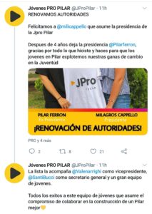 Ayer también los jóvenes de la JPro anunciaron el traspaso de mando de parte de la ex Directora de Escuela Municipales Pilar Ferrón a Milagros Cappello. Ellas solas, sin foto grupal y sin mención alguna del líder político del espacio, Nicolás Ducoté. Y con un mensaje de despedida para la generación de la mencionada Ferrón, que incluye a Pablo Pin Donoso, Carla Moriggia y compañía.