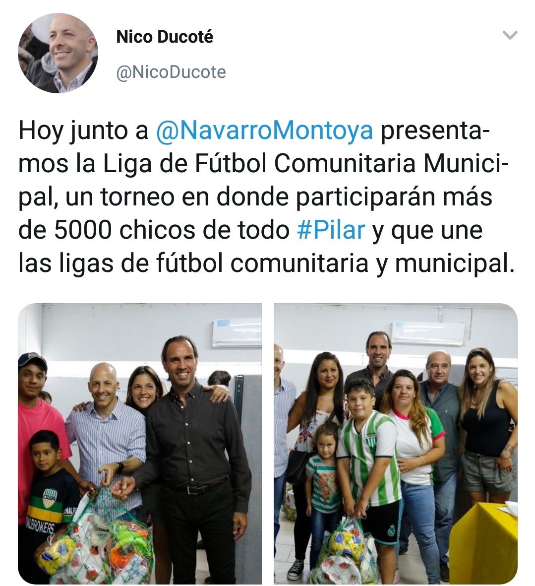 «Hoy junto a Navarro Montoya presentamos la Liga de Fútbol Comunitaria Municipal, un torneo en donde participarán más de 5000 chicos de todo Pilar y que une las ligas de fútbol comunitaria y municipal» publicó el Intendente Nicolás Ducoté a través de sus redes sociales durante el pasado fin de semana. Detrás de ese acto hubo un contexto que el jefe comunal prefirió obviar, ambas ligas iban a desaparecer por la coyuntura económica que atraviesa el país y la nula ayuda recibida por el estado. ¿Ahora si habrá apoyo para el desarrollo del deporte? No, todo seguirá igual pero con algunas fotitos con el Mono Navarro Montoya.
