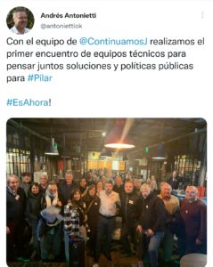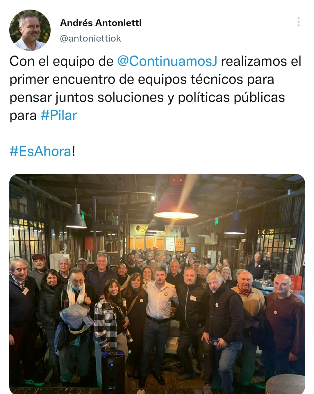 Las redes sociales parecen ser la herramienta ideal para darse a conocer a bajo costo, y sin tener un verdadero respaldo vecinal. Por ejemplo, hace un par de días atrás Juan Francisco Nosiglia (hijo de Coti Nosiglia, operador político de la UCR) presentó en sociedad a «Evolución Pilar». Según la descripción de la cuenta de Twitter respaldan a nivel nacional a Martín Lousteau y a Martín Tetaz. Osea un porteño, con quinta en Villa Rosa, a través de una simple publicación ya está buscando su espacio en la interna del próximo año.