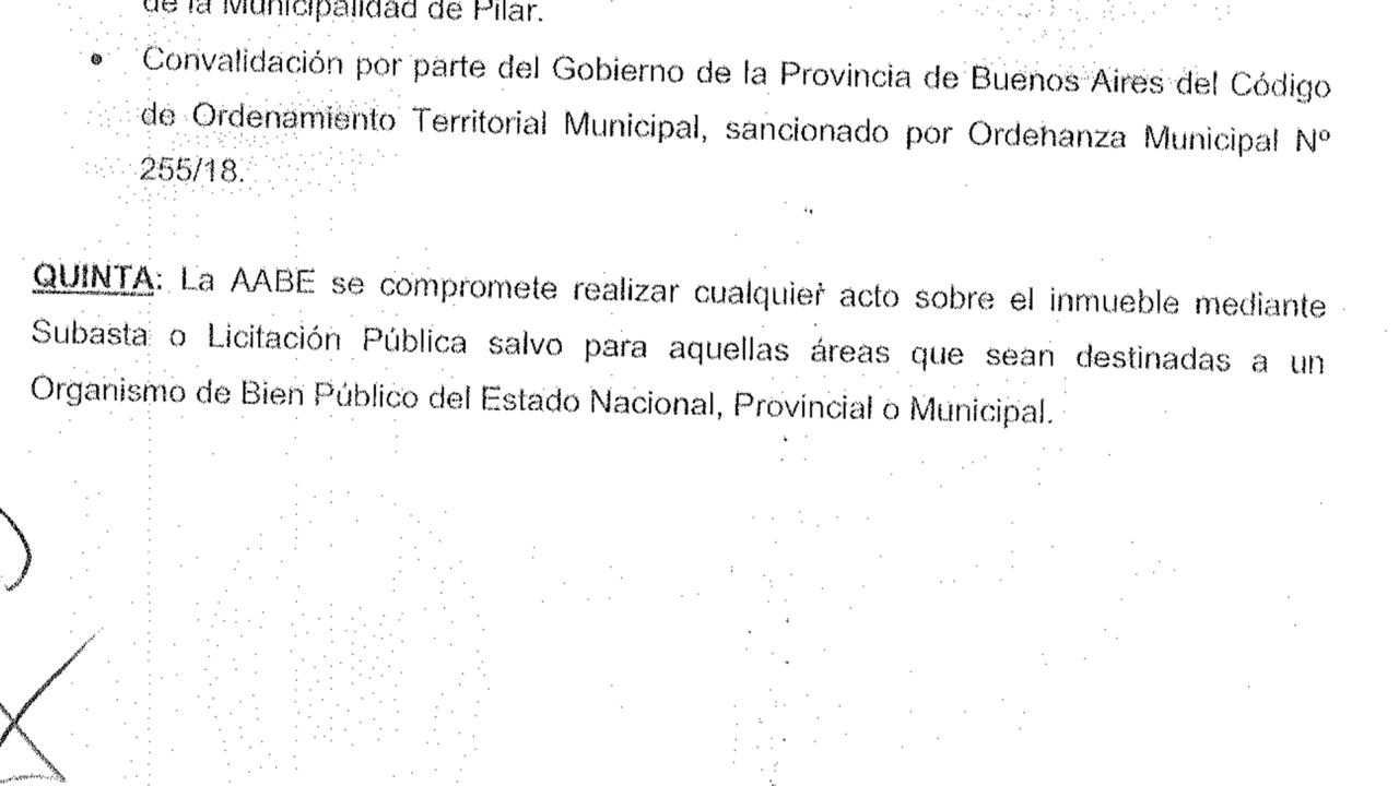 Sin dudas, el punto más llamativo del escrito es el quinto: «La AABE se compromete a realizar cualquier acto sobre el inmueble mediante SUBASTA o LICITACIÓN PÚBLICA salvo para aquellas áreas que sean destinadas a un Organismo de Bien Público del Estado Nacional, Provincial o Municipal». Si, todo el espacio que aún está libre de las 70 hectáreas del predio podrá ser rematado si el oficialismo se impone en la votación de esta mañana en el Concejo Deliberante. ¿Ósea pasará a manos privadas? Exacto.