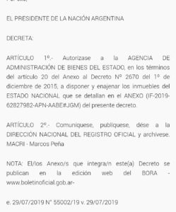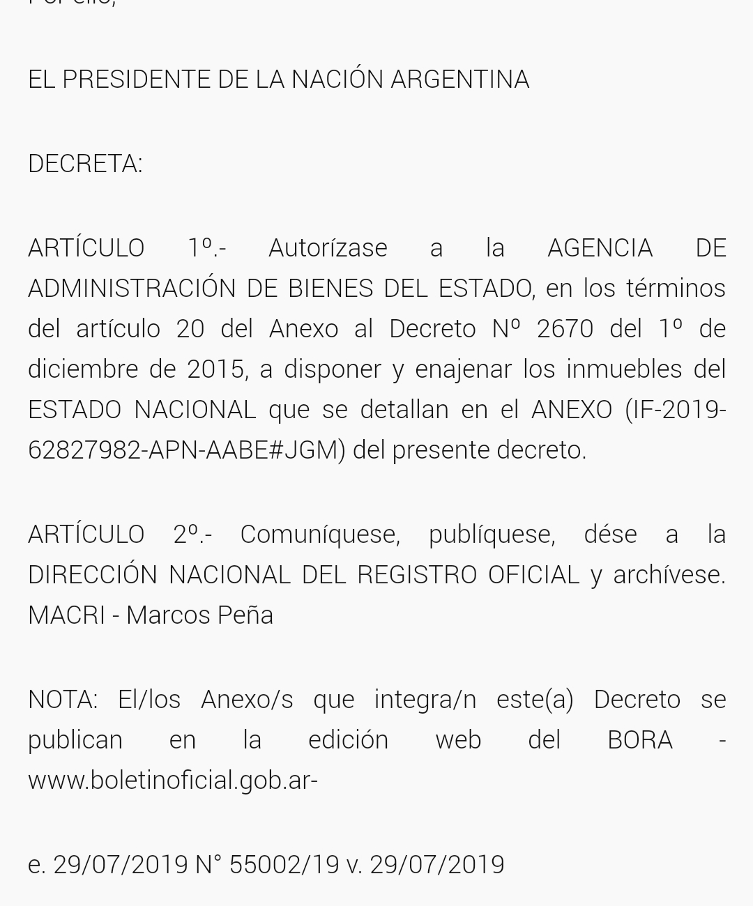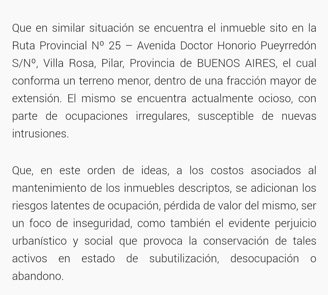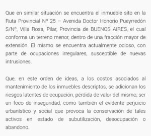 Que, en este orden de ideas, a los costos asociados al mantenimiento de los inmuebles descriptos, se adicionan los riesgos latentes de ocupación, pérdida de valor del mismo, ser un foco de inseguridad, como también el evidente perjuicio urbanístico y social que provoca la conservación de tales activos en estado de subutilización, desocupación o abandono». ¿Entregarlo en cómodato a instituciones locales no era una opción?